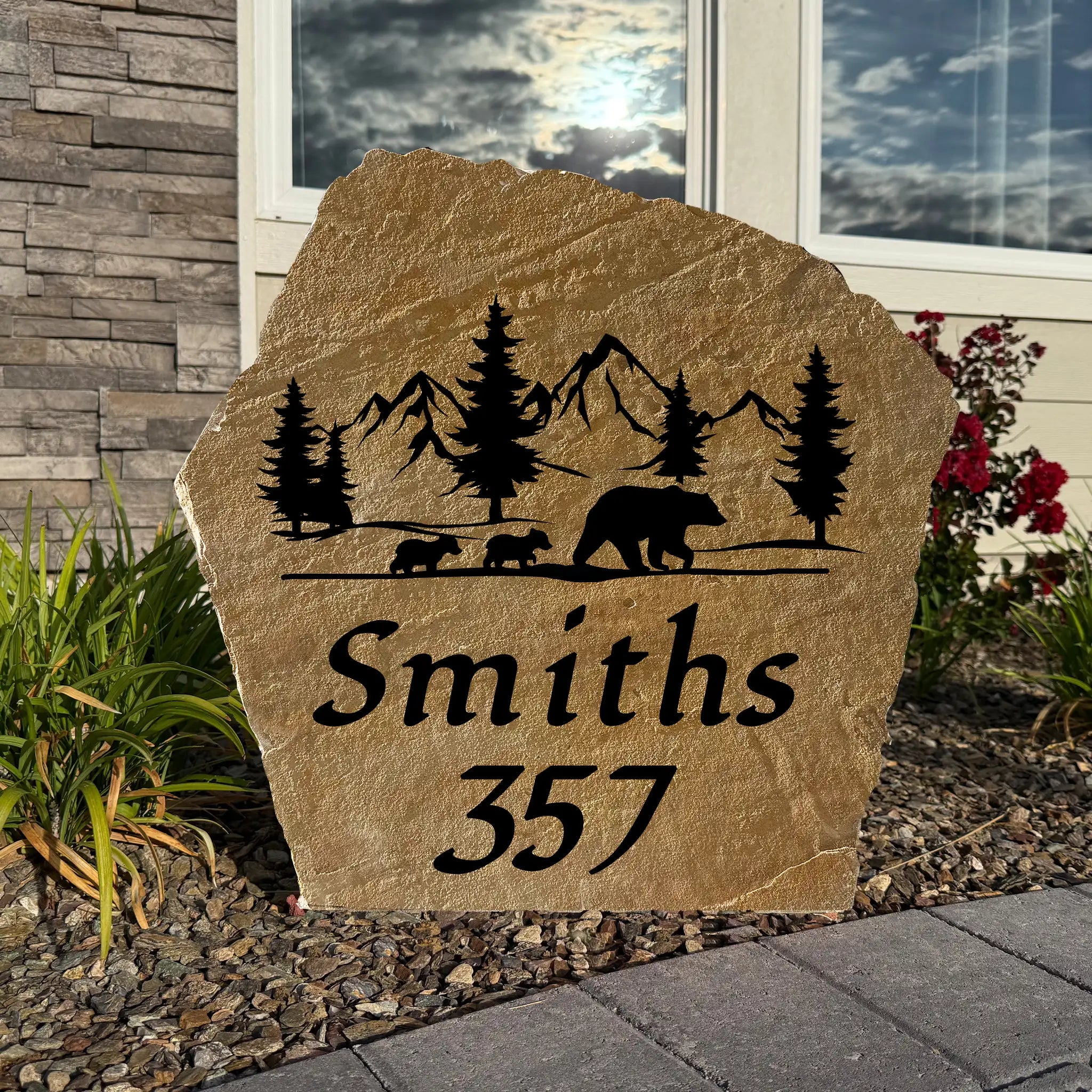 A personalized outdoor address sign carved into real stone with a bear family and mountain scene that brings the wilderness home.