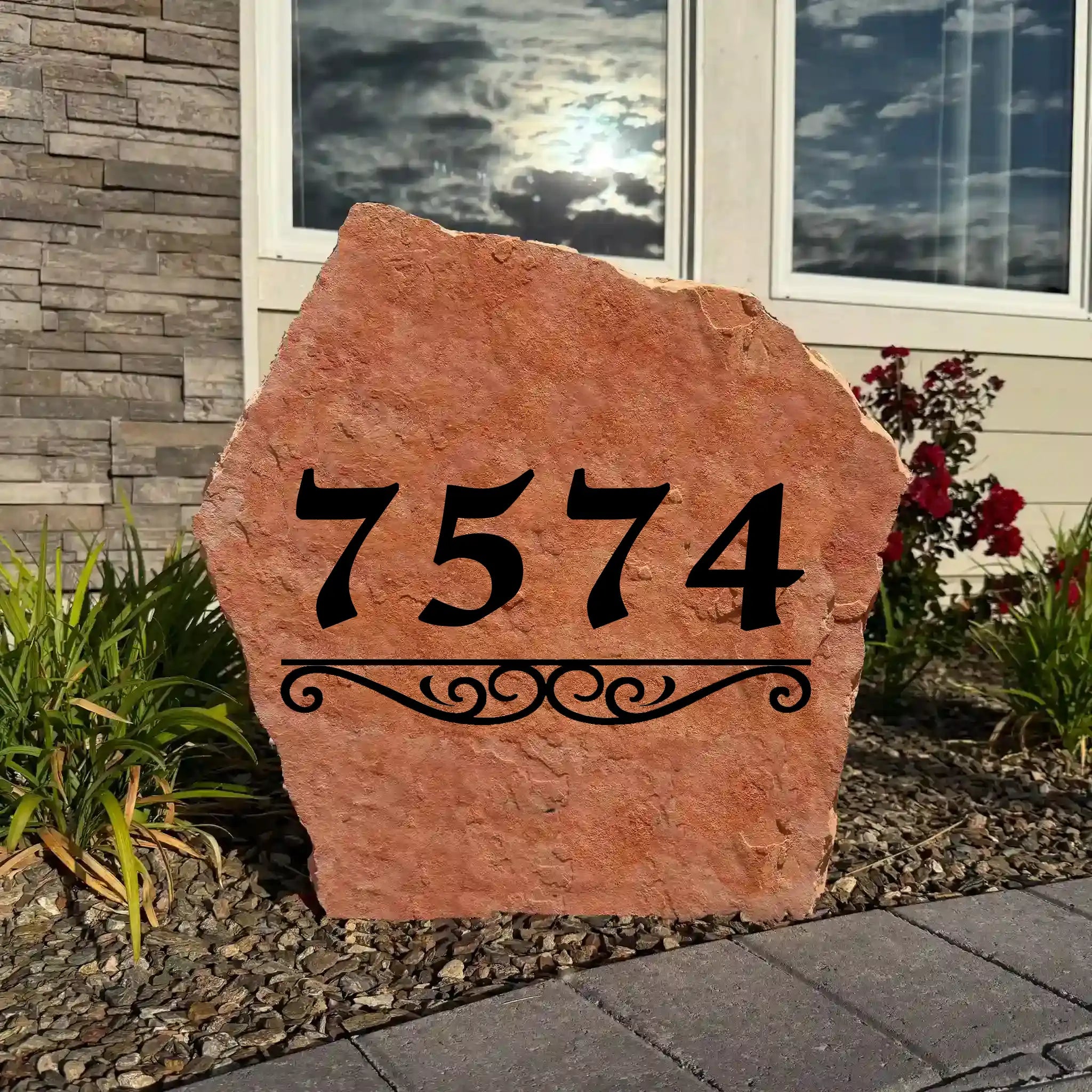 The Classic House Number Stone is made for homeowners who want their address to be easy to see and look great doing it. The design is bold, simple, and timeless, with a decorative scroll accent that adds character without making the stone feel busy. It looks right at home in modern landscaping, traditional yards, and everything in between.