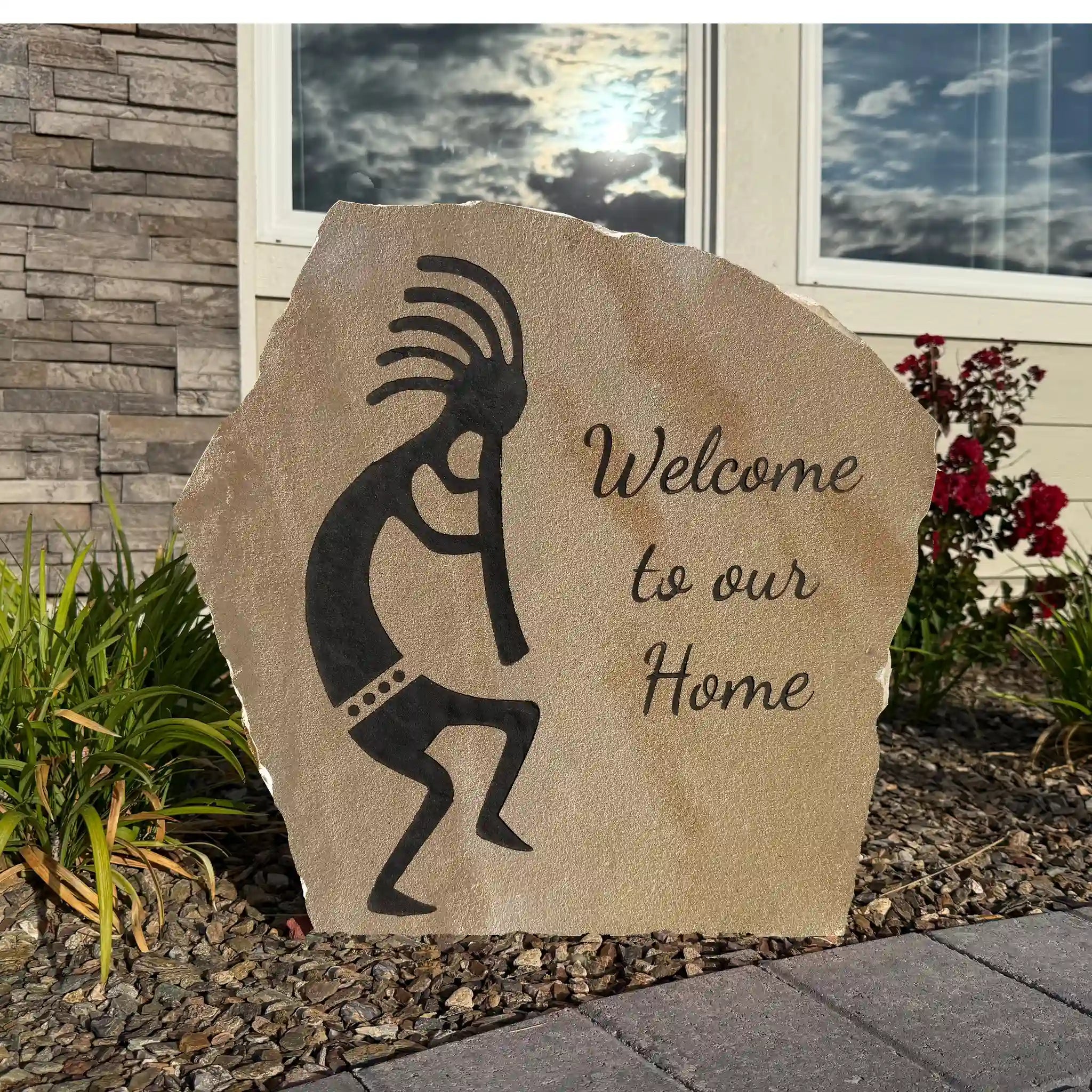 Each Kokopelli Welcome Stone is a one-of-a-kind celebration — hand-shaped, engraved, and finished to bring the vibrant spirit of the Southwest to your home.